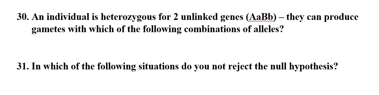 If the genotype is Aa Bb then 4 different kinds of gametes can be made. Four different types of gametes will be produced in that genotype in which heterozygosity will be present at two places. In which of the following situations do you not reject the null hypothesis.